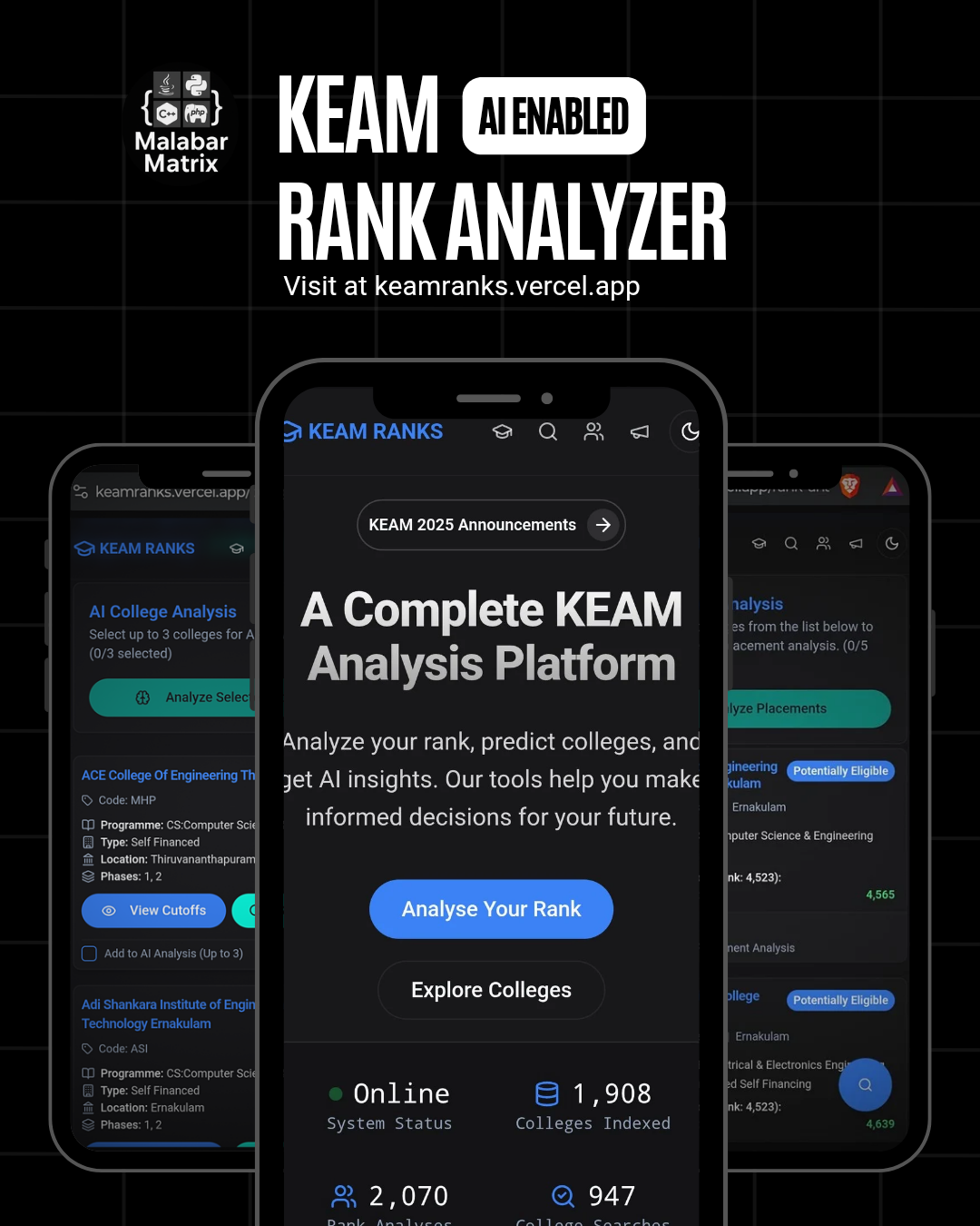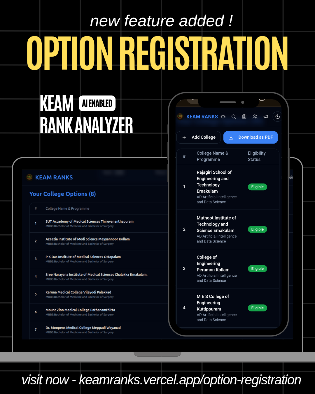 Hi All... I have been developing this platform for KEAM rank analysis, college search, option registration helping and all.. check out the site and tell your suggestions https://keamranks.vercel.app