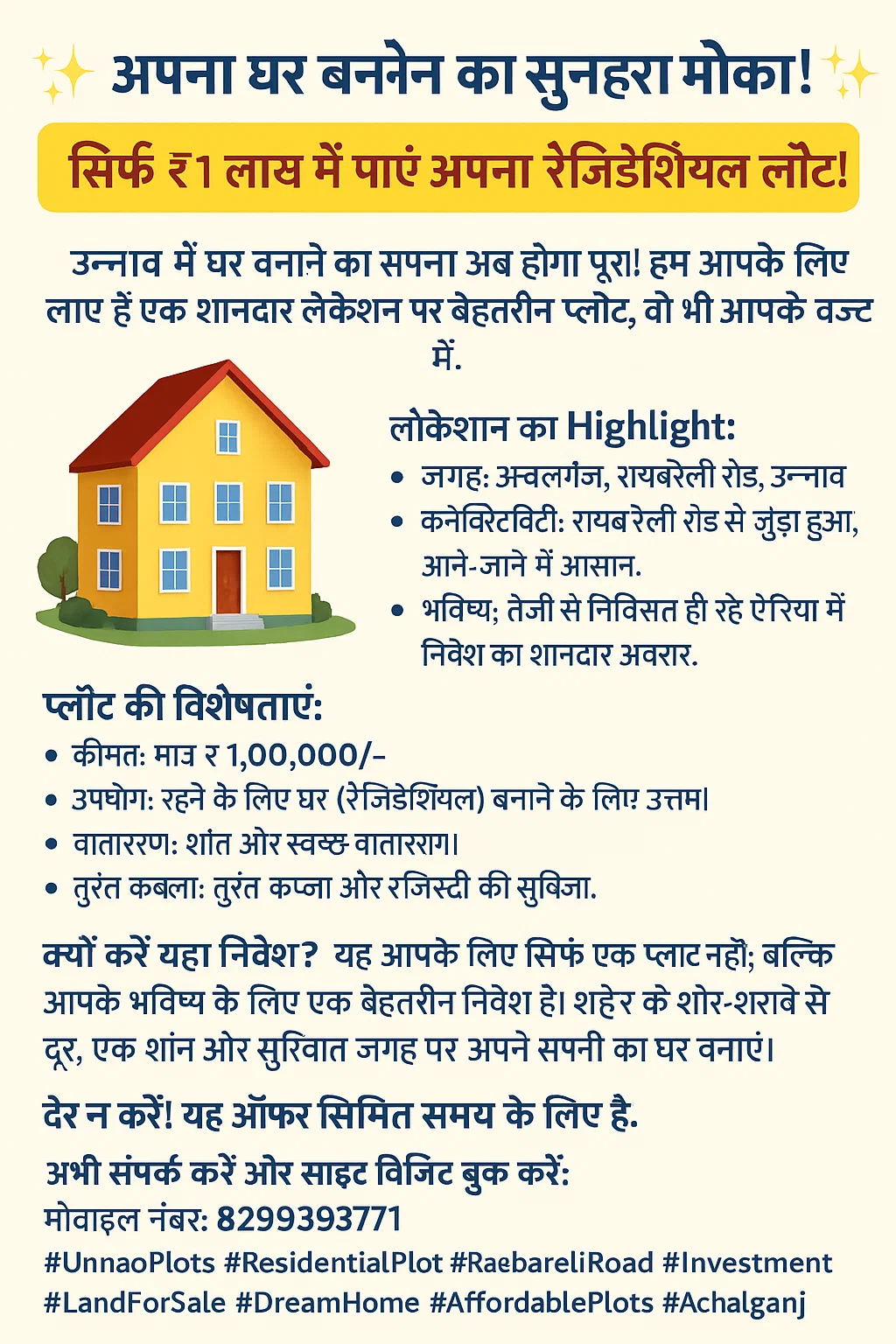 Namaste 🙏 Aapke liye ek *exclusive investment opportunity* lekar aaya hoon: 📍 Location: Achalganj, Raebareli Highway Road Unnao Uttar Pradesh 📐 Area: 2 Bigha 40 Bisua (5030 sqm) 💰 Price: ₹45 Lakh/Bigha 📌 Best for: Residential plotting & high returns Agar aap land investment me interested hain jahan aap plotting kar ke resale ya development se **multi-fold profit** kama sakte hain, toh yeh deal aapke liye hi hai. Site visit & full details ke liye mujhe WhatsApp/call karein 📲 +91 8299393771 Dhanyawaad 🙏
