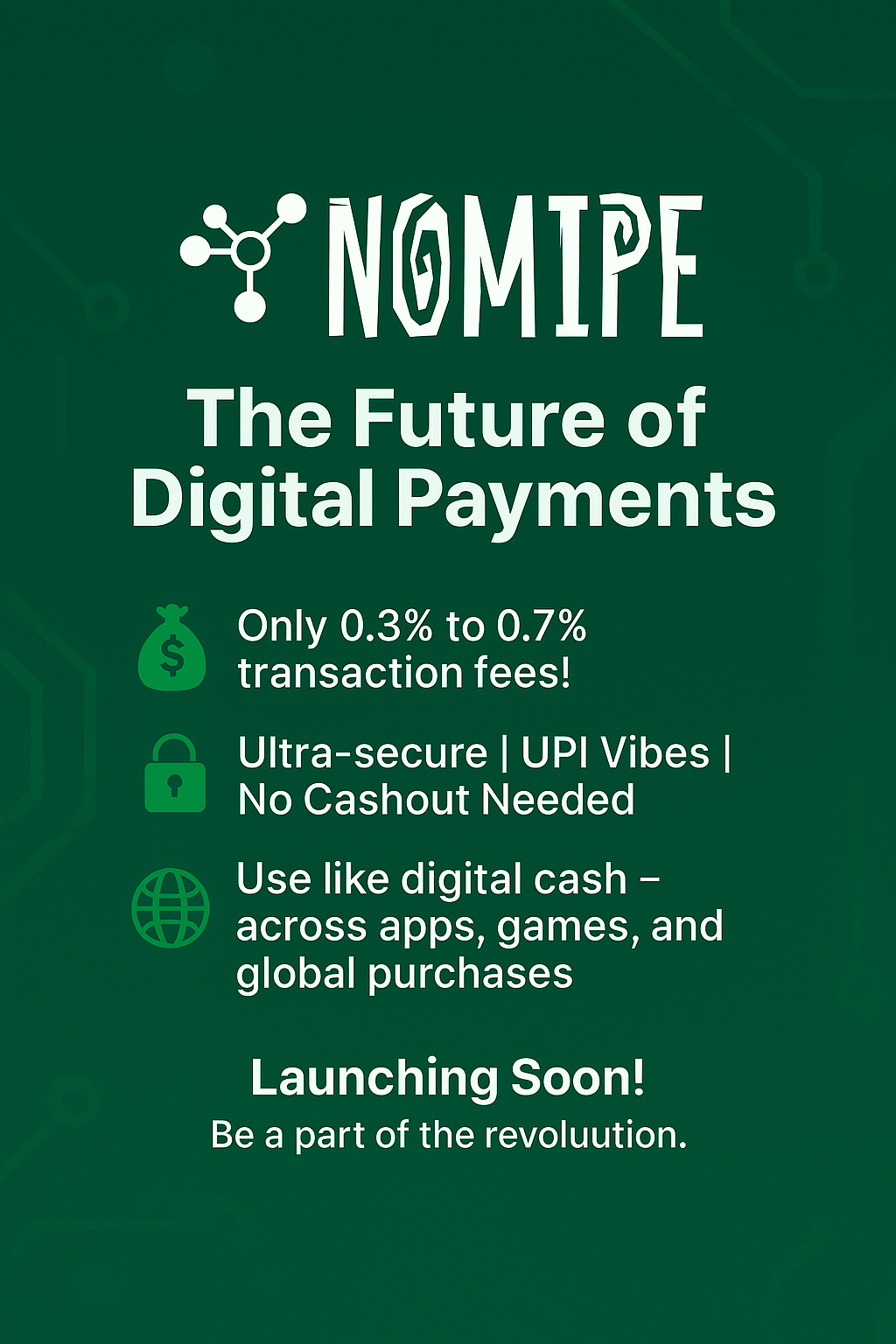 💸 Only 0.3% to 0.7% transaction fees! 🔐 Ultra-secure | UPI Vibes | No Cashout Needed 🌐 Use like digital cash – across apps, games, and global purchases 👉 Launching Soon!
