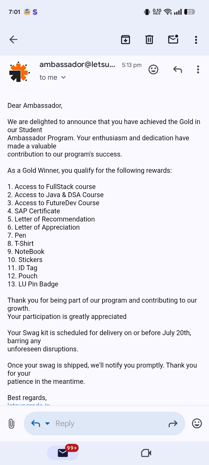 I Did It! 🎉 I've completed the Let's Upgrade Student Ambassador Program and achieved Gold status! 💃 #StudentAmbassador #LetsUpgrade #GoldWinner LetsUpgrade