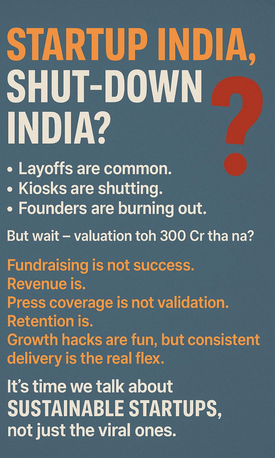 STARTUP INDIA, or SHUTDOWN INDIA? Layoffs are rising. Kiosks are shutting. Founders are burning out. But wait — wasn’t the valuation ₹300 Cr? It’s time we face the truth: Fundraising ≠ Success. Revenue = Success. Press ≠ Validation. Retention = Va