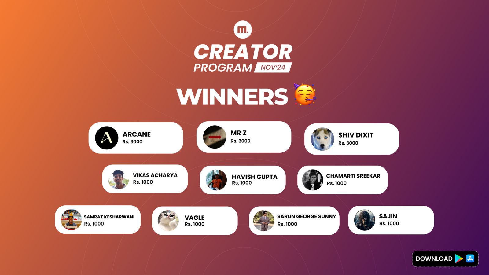 Announcing the winners of Creator Program (November 2024)- We had a great month of crazy content and information being shared on Medial and we're glad to recognise the top contributors! Top 3 who won Rs. 3k each- 1) Arcane 2) Mr Z 3) SHIV DIXIT N