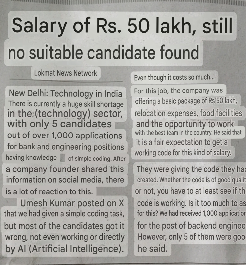 Salary of ₹50 Lakhs, still no suitable candidate found. Out of 1000 candidates only 5 have knowledge of simple coding.