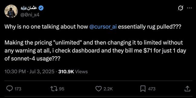 Cursor's shady pricing says unlimited but charges based on usage? someone tell them difference between unlimited and usage based pricing and if someone's using cursor , can you confirm this ?