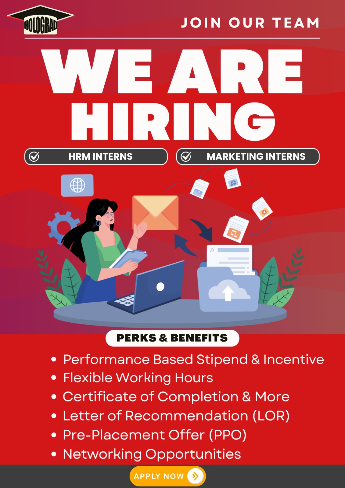 Join HoloGrad's Summer Internship Program!⭐ - About HoloGrad:* ⏩Innovative Edtech company revolutionizing education. - internship:- ⏩Human Resource Management and Marketing - Responsibilities: ⏩ *HRM* : Recruitment, employee engagement, HR operations ⏩ Marketing: Social media campaigns, content creation, brand promotion, customer engagement. - Benefits: - Performance-based stipend upto - Incentives - Certificates of Achievement - Letter of Recommendation (LOR) - Pre-Placement Offer (PPO) - Networking Opportunities - Duration: 60 days - Qualification: 12th Pass/UnderGraduate/PostGraduate - Apply: comment