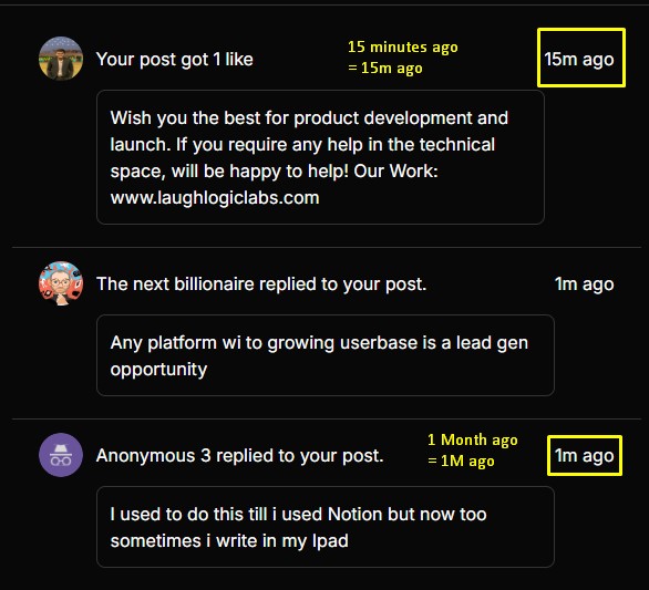 For Medial Team, don't know if it is done or purpose or not. The time of update we see with the notification lacks clarity. Both minutes and months have the same UI. As shown in screenshot 15 minutes ago and 1 month ago both has small m. Ideal way