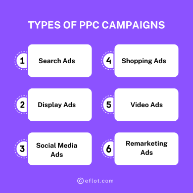 Types of PPC Campaigns - Eflot PPC (Pay-Per-Click) campaigns come in different types, each designed to achieve specific marketing goals. The main types include Search Ads, Display Ads, Shopping Ads, Video Ads, and Social Media Ads. Search Ads appear