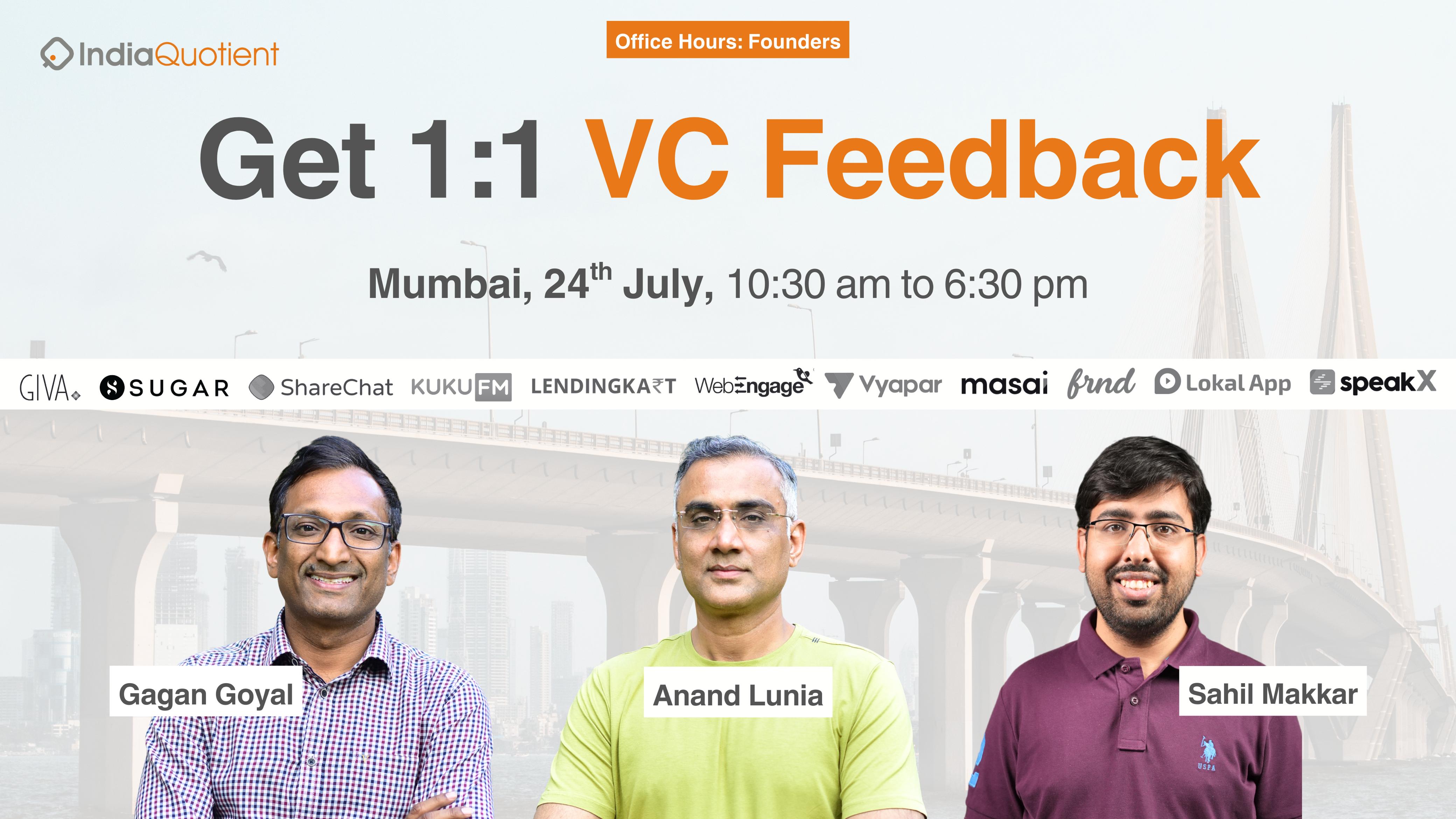 Opportunity for Mumbai founders👇 Got a startup idea? Come discuss it 1:1 with a VC. You might just find your first backer here 🙂 We have been active in India’s startup ecosystem for over a decade, early backers of ShareChat, Sugar Cosmetics, Giv