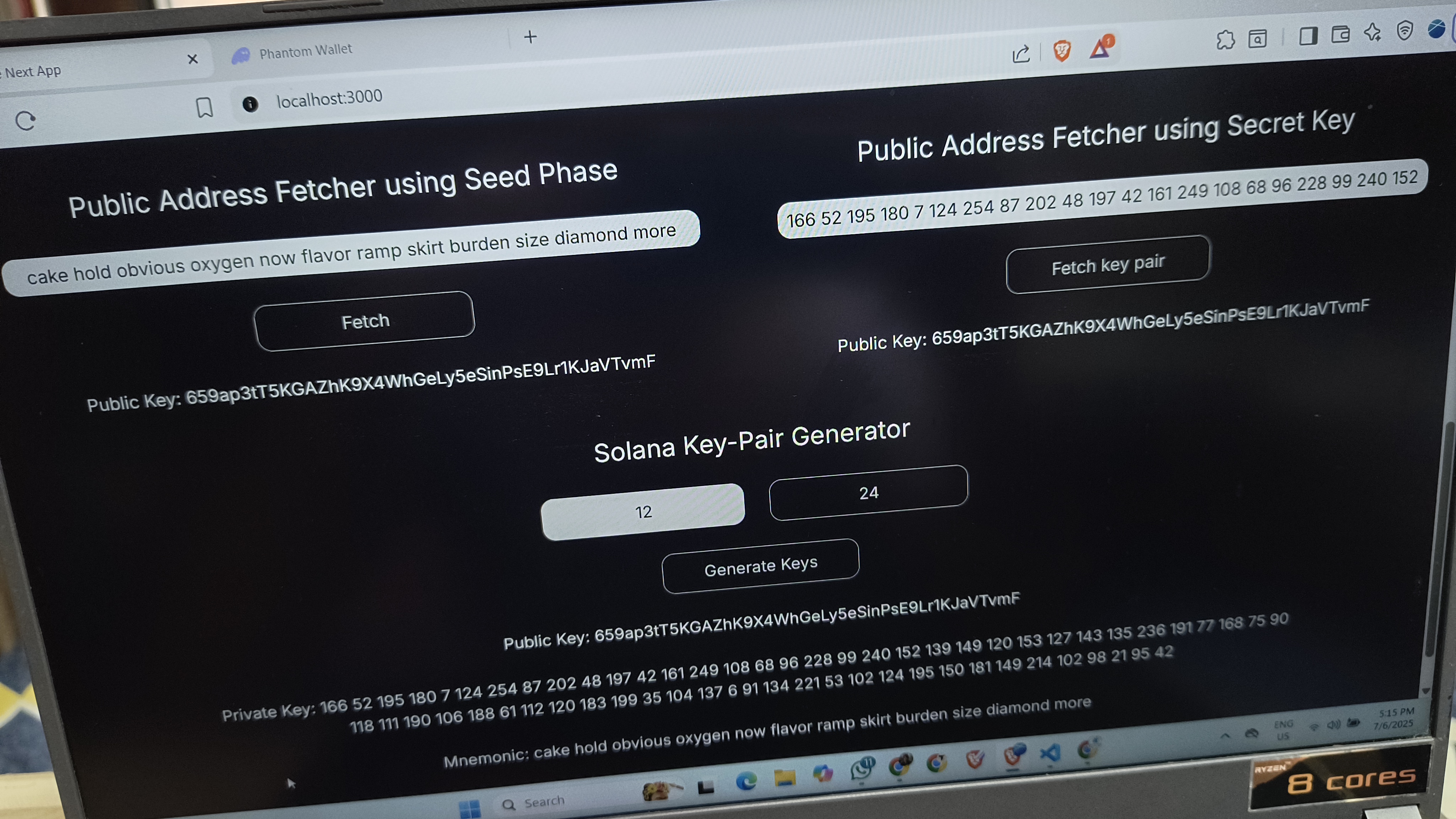 Just built a Solana keypair generator + public address fetcher using both seed phrase & secret key🔑 Console logs looking spicy🔥 #Solana #SolanaDev #Web3 #Web3Community #Blockchain #BuildInPublic #Security #Mnemonic