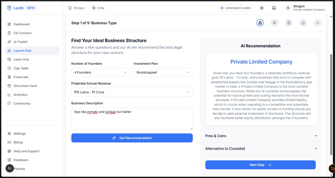 Overwhelmed by the response on my previous post 🔥 Here a another sneek peek - ( You guys deserve it ) Most startup mistakes begin before the startup begins.” That’s why we built a feature "Launch Pad" your AI co-pilot to set up the right legal foundation from Day 1. - No more second-guessing Pvt Ltd vs LLP - No more Googling NIC codes at 2AM - No more asking 5 different CAs for the same answer Here’s a peek at Step 1 – and yes, it only gets better from here. Built with feedback from the Medial tribe, big thanks to everyone who nudged us in the right direction. 🔓 Beta opening soon. Want early access? Drop a 🚀