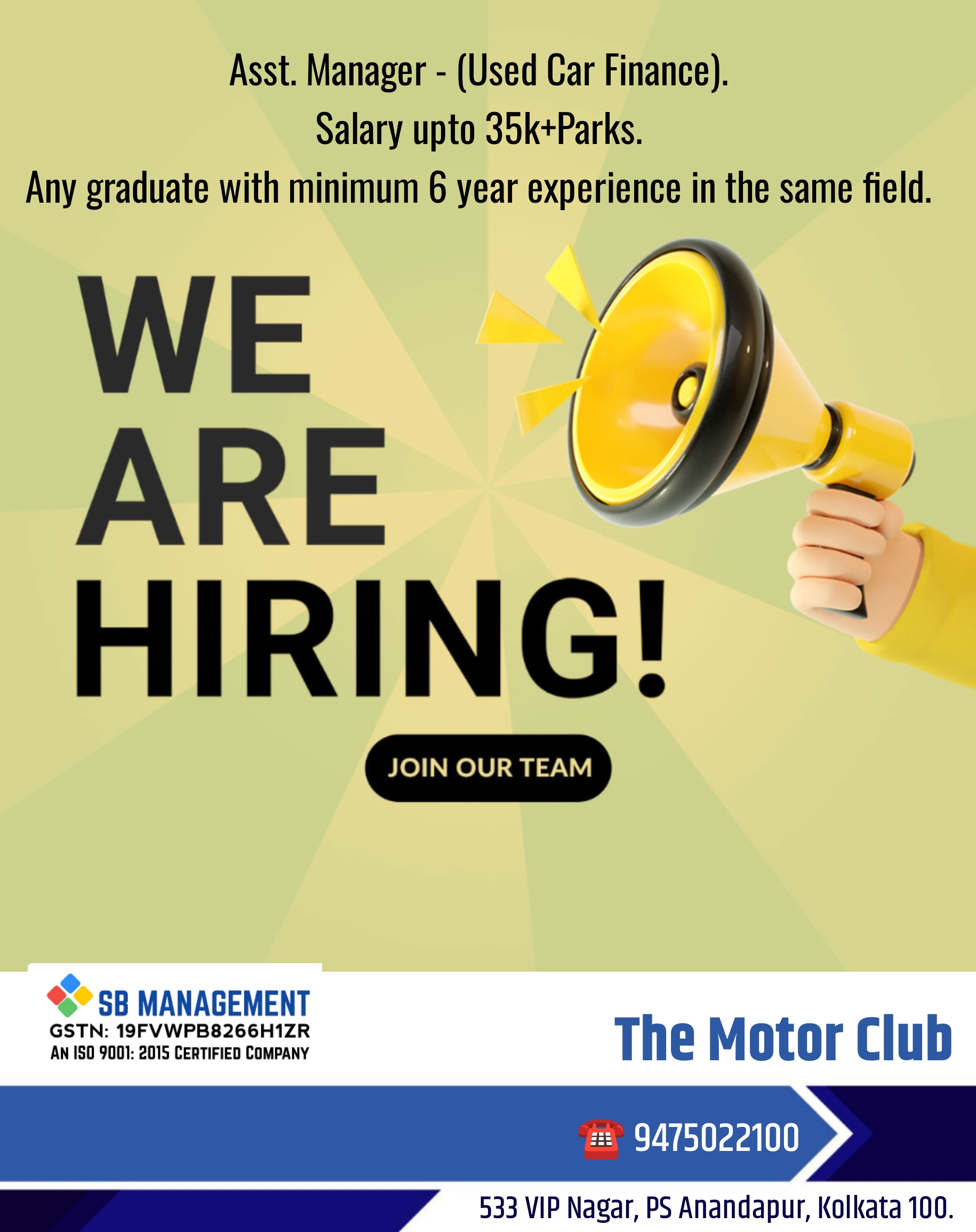 Job opportunities for Kolkata. We are looking for Asst. Manager used car loan.