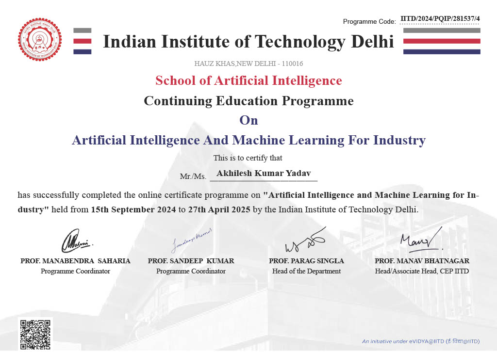 Personal Milestone Unlocked | IIT Delhi AI & ML Certification I’ve successfully completed the "Artificial Intelligence and Machine Learning for Industry" programme offered by Indian Institute of Technology, Delhi under the Yardi School of Artificial Intelligence and Continuing Education Programme (CEP). This 6-month intensive course was more than just academic—it was about applying AI to solve real-world business problems. Key Takeaways: Practical mastery of ML & DL algorithms (Regression, SVM, Decision Trees, CNN, RNN, Transformers, GANs, GNNs) Real-world projects including: Recommender Systems Sentiment & Image Analysis Generative AI & Text Summarization 230+ hours of learning including live sessions, capstone projects, and industry case studies Open to full-time, and collaborative roles with startups or enterprise teams working on impactful AI solutions. If you're hiring or know someone who is, feel free to connect or DM me!