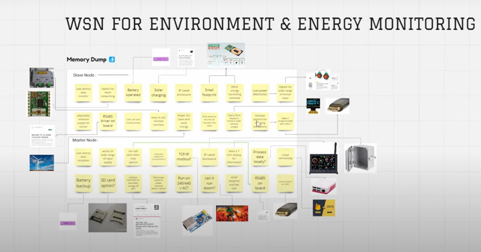 #Day1 Purpose - hardware product from scratch! Sometimes, with a sense of responsibility we want to build a product to solve a problem and make life better for everyone. But as a maker it can sometimes be a random and impulsive Idea! In my case I just wanted to build a product for a contest and also it should have some environmental impact. My Goal : To create a low-cost, scalable wireless sensor network (WSN) that any farmer or greenhouse operator can deploy. This system will monitor real-time data crop health, temperature, humidity, soil nutrients, and energy usage so we can make precise decisions, save resources, and boost productivity. Here's a example video : https://www.youtube.com/watch?v=_qDI99OTmmE As a first step to build any product, put the idea into a paper. Rough sketch or just random points how it can be used/installed/marketed and everything related to the product. I call this memory dump 🚮 In the next post we will discuss how we can streamline the product idea and manage the product development process from the ideas we dumped into the board.