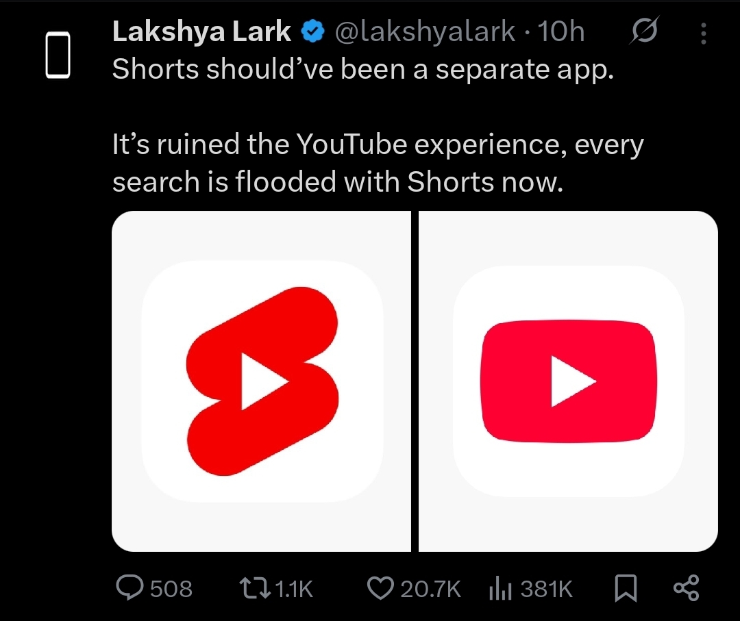 YouTube is slowly becoming ShortTube. 😤 Is anyone else getting seriously annoyed by how YouTube pushes Shorts now? Every time I open the app, it jumps straight into Shorts. I didn’t ask for that. When I search for proper videos, I have to scroll p