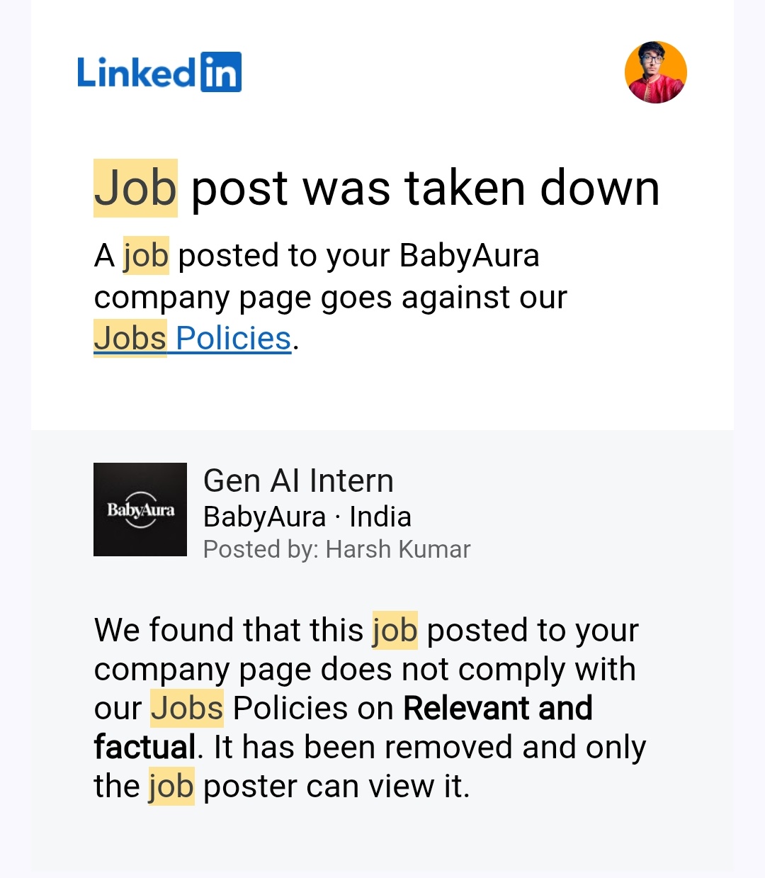 You won't believe but once Linkedin's bot wrote a job post for me, I posted it and hours later LinkedIn Team rejected it saying this post do not adhere to their guidelines. I Wonder what they wanna achieve in life? 😅