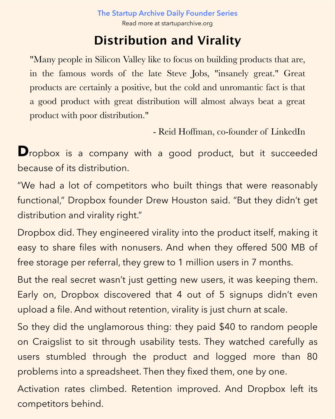 DISTRIBUTION AND VIRALITY Many people in Silicon Valley like to focus on building products that are, in the famous words of the late Steve Jobs, "insanely great." Great products are certainly a positive, but the cold and unromantic fact is that a g