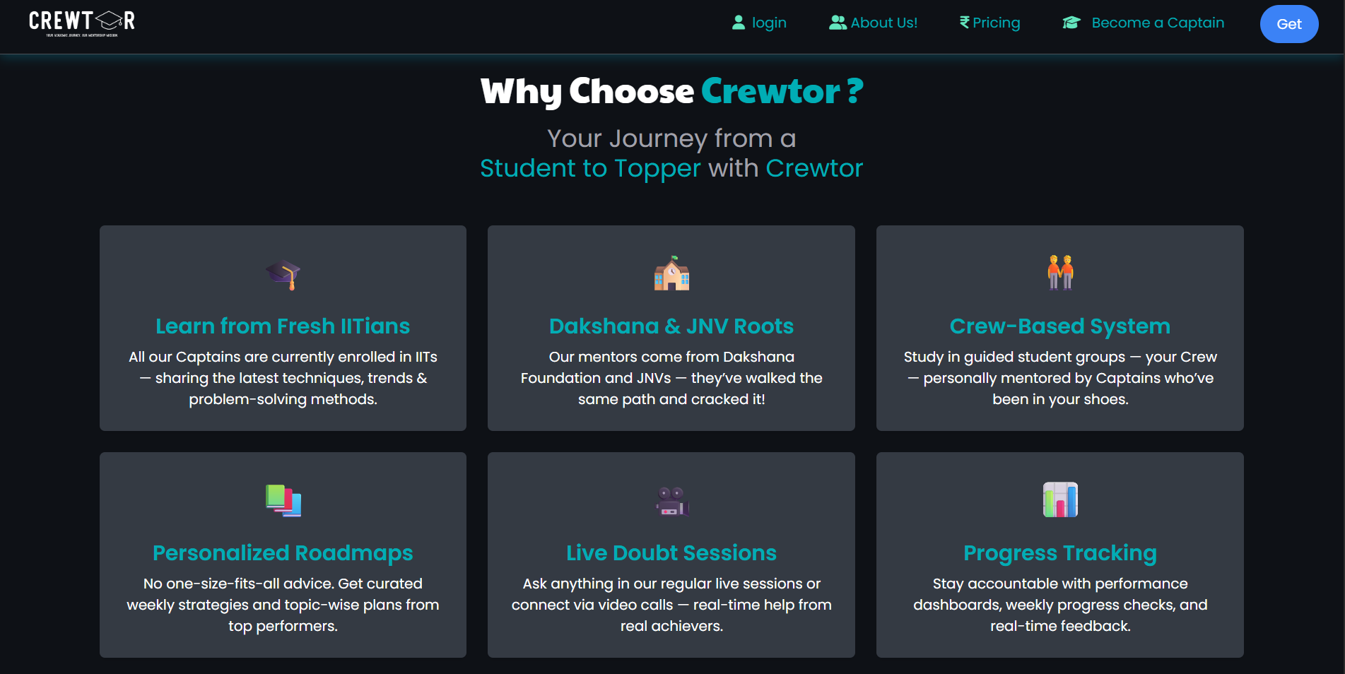 🚀 From Vision to Impact — The Story of Crewtor In a world full of distractions, consistency has become a rare superpower. That’s exactly why we built Crewtor — a mentorship-driven learning platform where students don’t walk alone. 🎯 At Crewtor, every student becomes part of a “Crew”, led by a top mentor (Captain) from institutes like IITs/NITs. Together, they follow structured weekly plans, live sessions, and receive accountability support — just like a real-life team chasing success. 👨🏫 No algorithms. No fake gamification. Just real mentorship, progress tracking, and human support. ✅ Already, we’ve onboarded our first batch of students and held live sessions with amazing engagement. 🛠️ Built with love by students, for students — Crewtor is not just a platform, it’s a movement of consistency and community. 💬 If you're someone who believes in mentorship, discipline, and peer learning — let’s connect. 📎 Know a student who needs this? Or a mentor who wants to give back? Reach out — we’re just getting started.