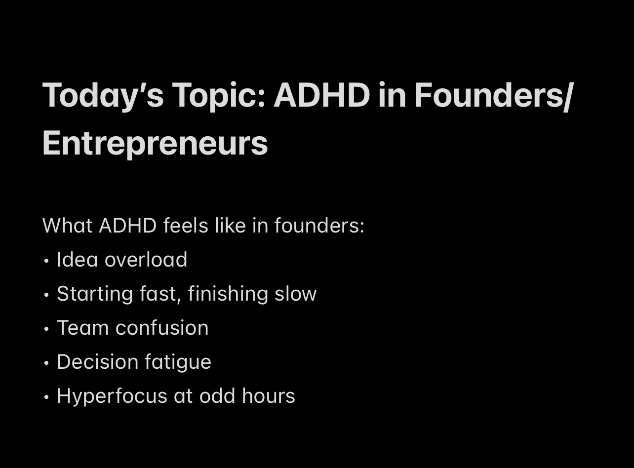 Is “Founder ADHD” real or just another badge of hustle culture? You’ve heard it, “I’m a founder, of course I have ADHD.” But is it real, or are we mistaking burnout and overload for a disorder? Research shows 20 to 25 percent of entrepreneurs exhibit ADHD traits versus just 5 percent in the general population. Hyperfocus, impulsive decision-making, and high risk appetite can feel like superpowers. But unmanaged, they lead to chaos, unfinished ideas, team confusion, emotional swings. It may not be clinical ADHD. But startup stress, sleep loss, and constant dopamine spikes can mimic it closely. The fix? Self-awareness. Structure. Coaching. Delegation. Founders don’t need to be flawless, they need to be functional. This isn’t about glorifying ADHD, but understanding how to build with it, not despite it. Have you felt this too? Let’s talk about it, without the filter.
