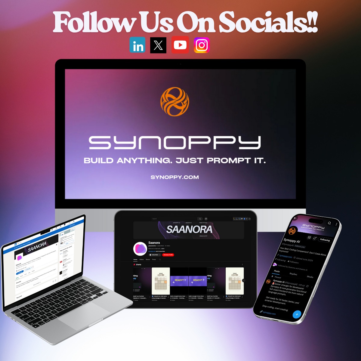 ✨ We’re building the future of coding with Synoppy. And yes — we’re now active on all your favorite platforms 🚀 Follow us everywhere for dev tips, builds, AI drops, and startup madness. 👉 LinkedIn- Saanorahq | X- SynoppyAI | YouTube- SaanoraHQ |