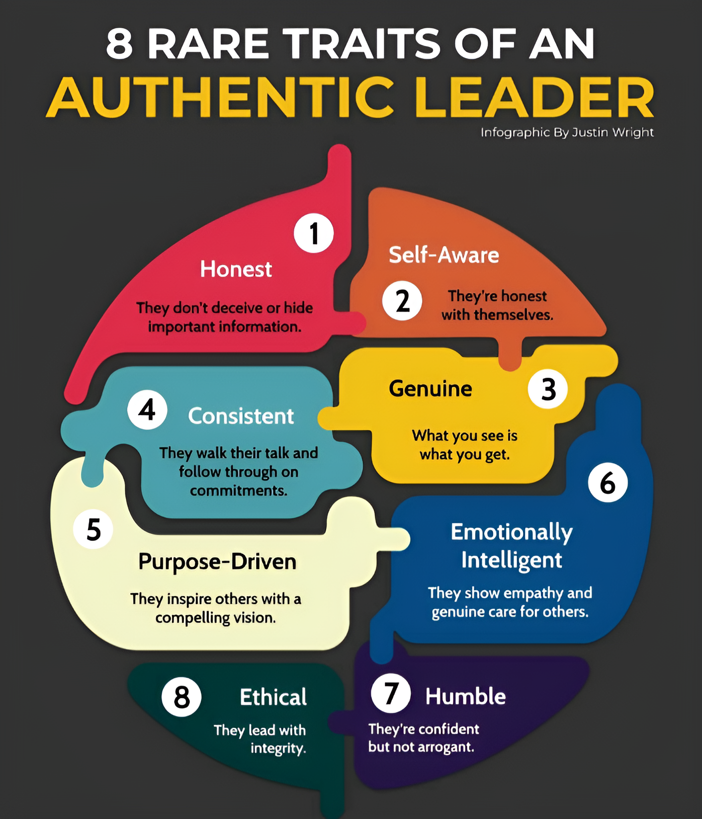 8 Rare Traits of an Authentic Leader, highlighting qualities such as honesty, self-awareness, consistency, being genuine, purpose-driven, emotionally intelligent, humble, and ethical leadership. These traits form the foundation of effective and trust
