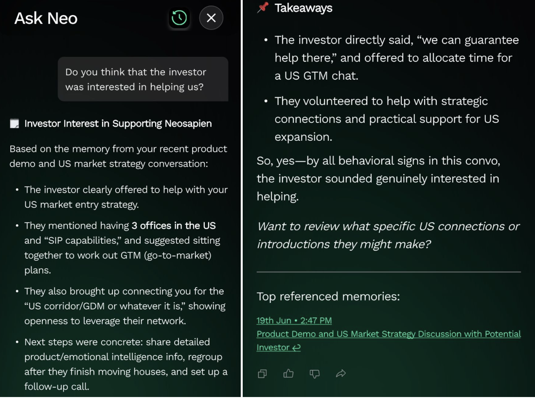 We are now live with Ask Neo V2. It now leverages full user context and relationship graph to support in - a) Decision Making, b) Recall and c) Emotional Intelligence. First of it’s kind - Neo can now cite specific memories to give you the most rele