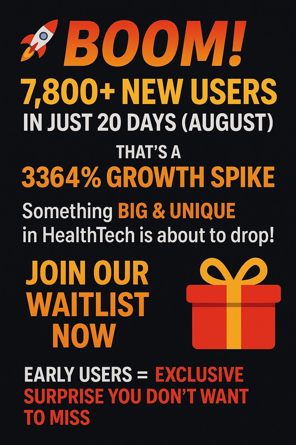 ๐ 7,800+ New Users in Just 20 Days (August)! A massive 3364% growth ๐คฏ๐ฅ โ and weโre only getting started. ๐ก Something unique in HealthTech is coming soon! Stay tuned, join our waitlist today, and unlock an exciting surprise for early users ๐โจ ๏ฟฝ