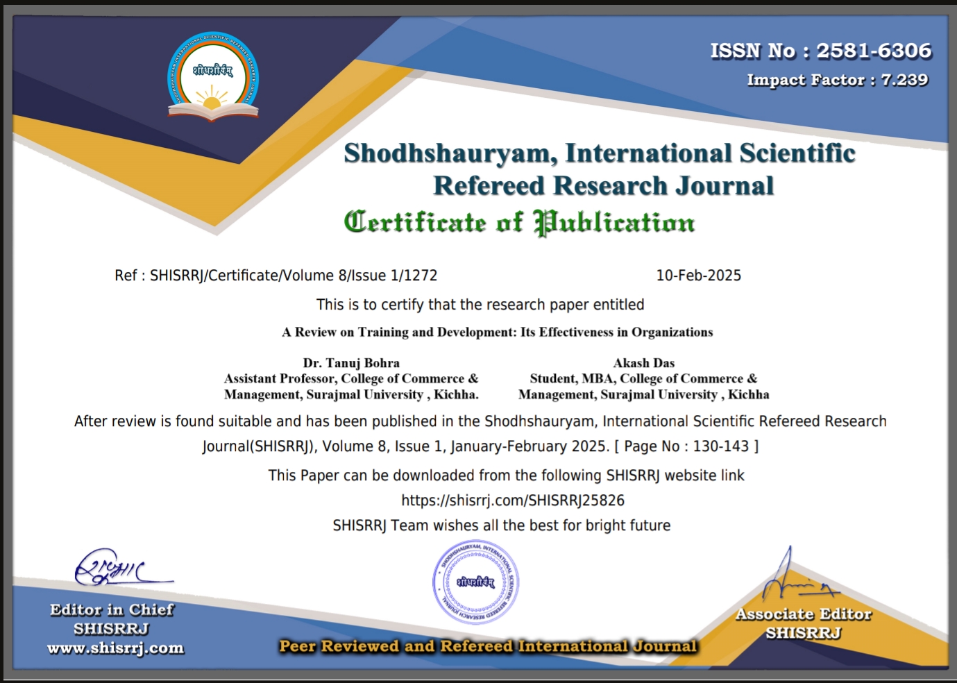 Thrilled to share that my research paper titled ‘A Review on Training and Development: Its Effectiveness in Organizations’ has been officially published in the Shodhshauryam, International Scientific Refereed Research Journal (Volume 8, Issue 1). A big thank you to my guide Dr. Tanuj Bohra and Surajmal University, Kichha, for their constant support and encouragement. You can read the full paper here: https://shisrrj.com/SHISRRJ25826 Grateful for this milestone and looking forward to more!