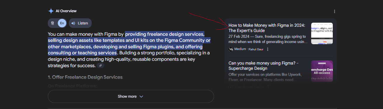 Last year I wrote “How to Make Money with Figma in 2024.” Today, that piece ranks on Google—and it’s featured in the AI overview. In simple terms: my writing gets found and it gets read. Here’s the thing—good content isn’t luck. I build it to win: