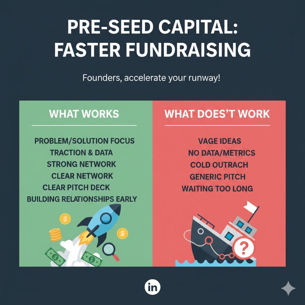 Pre-Seed Founders: Stop Burning Runway. Raise Faster. 🚀 Fundraising at the pre-seed stage doesn't have to be a slow grind. You need to focus on impact and efficiency. ✅ What WORKS for Speed • Proof Points Over Potential: Get any traction (sign-ups,