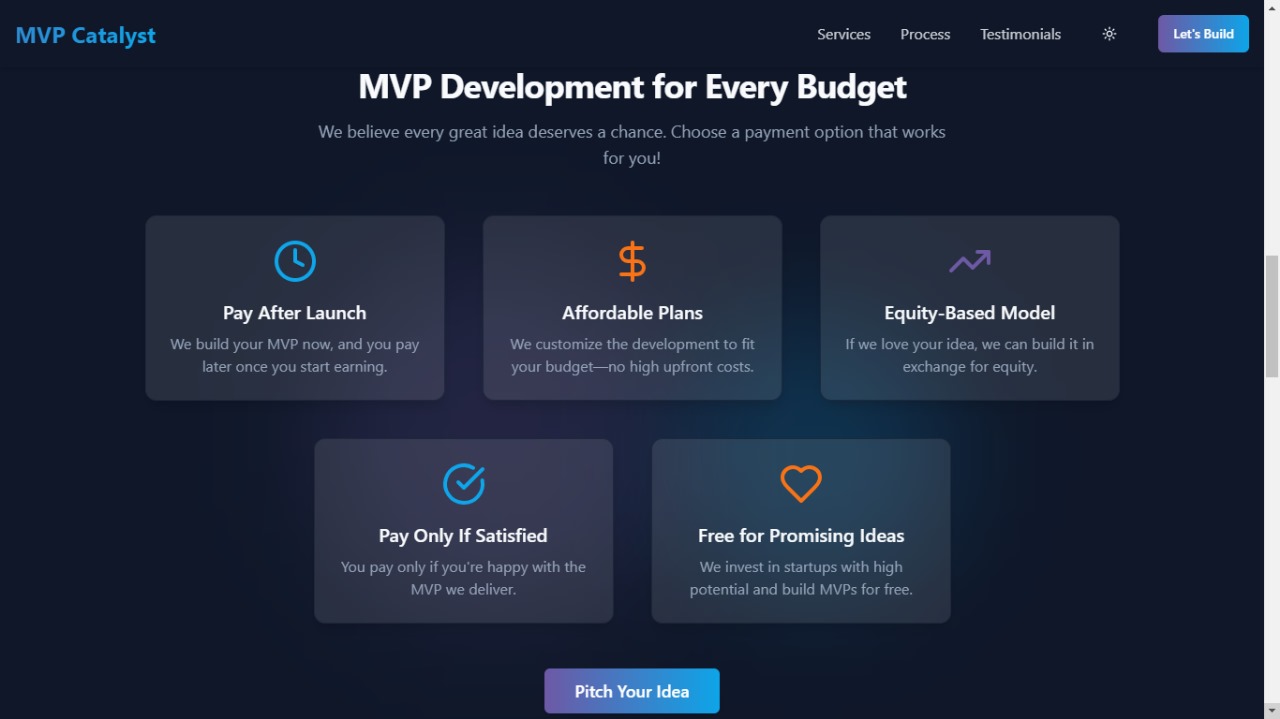 🚀 Build Your MVP Without Financial Barriers! At MVP Catalyst, we help startup founders turn their ideas into reality with flexible payment options: ✅ Pay After Launch – Build now, pay later when you start earning. 💰 Affordable Plans – Custom deve