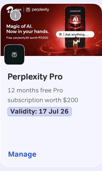 If you're an Airtel user, you can now claim 1 year of Perplexity Pro access ā 100% free. No subscription. No payment. Just a tap away. š² š How to get it? Open the Airtel Thanks app Click on āClaim Giftsā Enjoy 1-year full access to Perplexity P