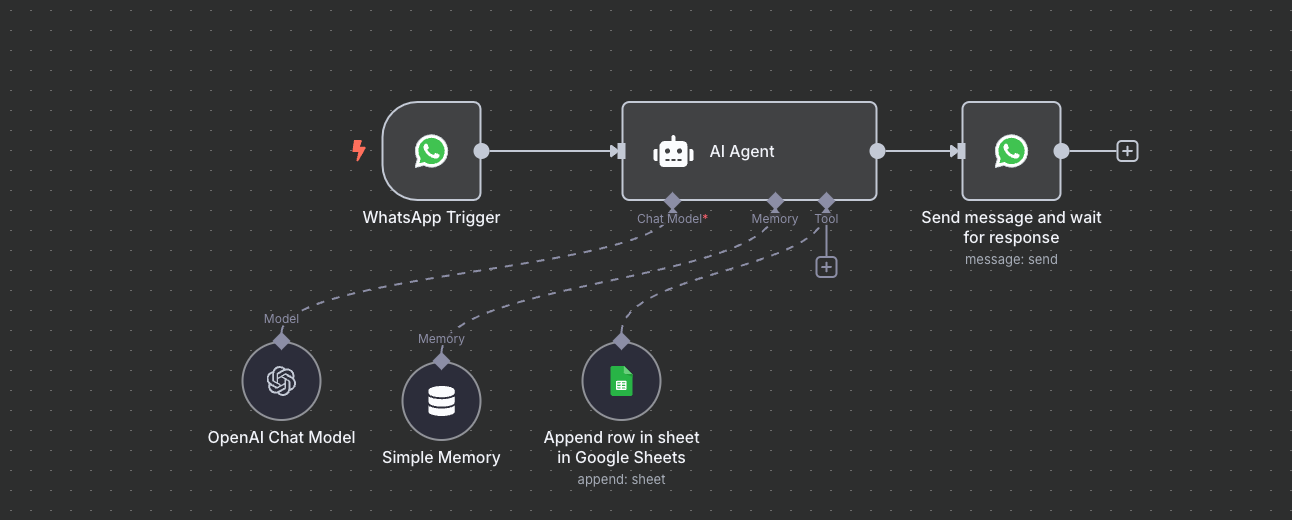 Another day and another automation. This one? A WhatsApp-based AI agent that’s not just chatting and it’s working. ⚙️ Handles inbound conversations 📄 Logs every interaction into Google Sheets 📦 Tracks inventory in real-time 📅 Schedules calendar invites like a human assistant All powered by OpenAI, memory-managed logic, and seamless integrations. A step closer to autonomous customer ops, built with workflows, not code. Just how we like it. Built. Shipped. Moving on to the next
