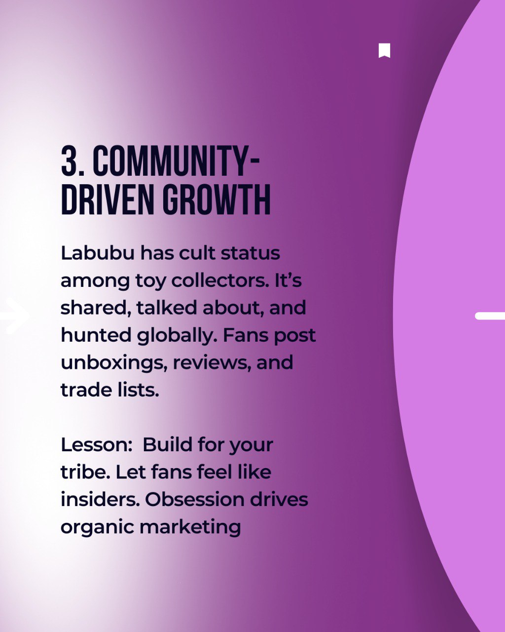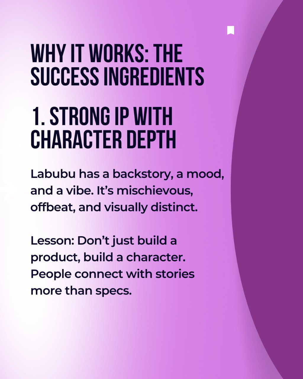1. Startup Breakdown: Why the Labubu Doll Is a Hit And What Founders Can Learn from It The Product: Labubu isn’t just a doll, it’s an art collectible with personality, it taps into the designer toy market, blending art, emotion, and scarcity. 💡 Why It Works — The Success Ingredients: 1️⃣ Built Like a Character, Not Just a Product Backstory, attitude, vibe. People remember stories, not specs. 2️⃣ Scarcity Is Baked In Limited drops + mystery boxes = FOMO. Exclusivity becomes identity. 3️⃣ Community Is the Engine Fans don’t just buy, they hunt, share, trade, post. That’s organic growth at work. 4️⃣ Local Soul, Global Appeal From Asia to the world, design with emotion, scale with culture. 5️⃣ Niche First, Then Scale Smart It stayed artist-led. Pop Mart amplified it without dilution. 👉 Lesson: Build IP with heart. Obsession > reach. Community > campaigns. The Big Takeaway for Founders: Labubu is proof that: • Storytelling is strategy • Niche is powerful • Community is currency