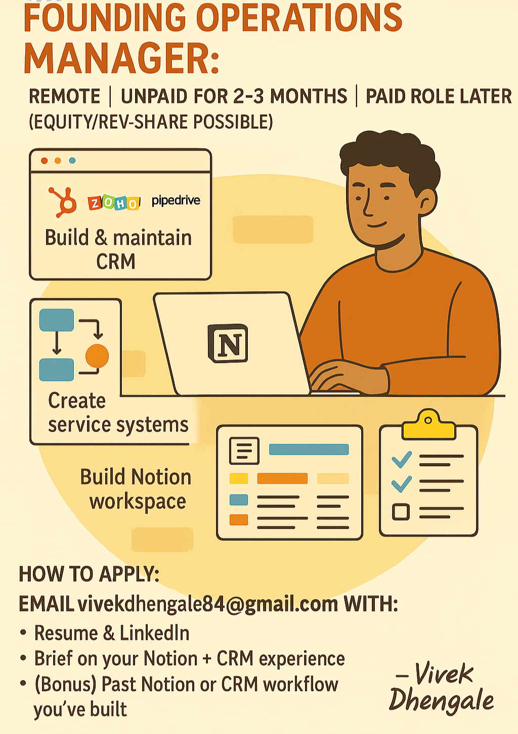 🚀 Founding Operations Manager (Notion + CRM Expert) Remote | Unpaid for 2–3 Months | Paid Role Later (Equity/Rev-Share Possible) We’re an early-stage service startup looking for someone skilled in Notion and CRM tools (HubSpot, Zoho, Pipedrive, etc.) to build and manage our operational systems. You’ll Handle: Build & maintain our CRM (leads, clients, onboarding, follow-ups) Create systems for streamlined service delivery Build a full Notion workspace for managing clients, freelancers, SOPs, tasks, and docs Keep the team organized and on track Ideal Fit: Experience with Notion + CRM Love for turning chaos into clarity Okay with no salary for 2–3 months while we gain traction How to Apply: Email vivekdhengale84@gmail.com with: Resume & LinkedIn Brief on your Notion + CRM experience (Bonus) Past Notion or CRM workflow you’ve built Let’s build something meaningful together. — Vivek Dhengale