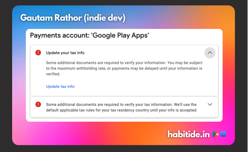Has anyone else faced this with Google Play tax info? So I ran into a weird issue recently while updating tax info on Google Play Console I submitted my official ID (which has my real name: Gautam Singh Rathor), but my account is under my business na