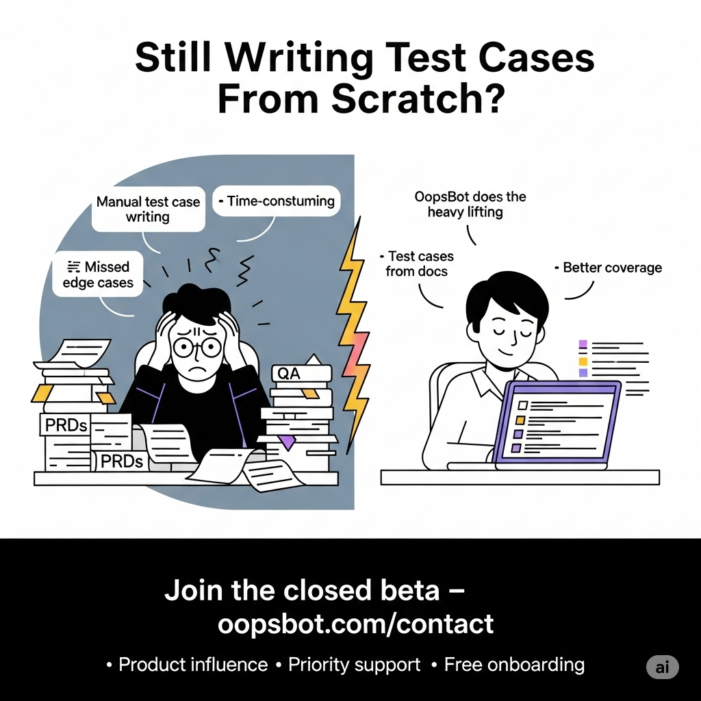 We’re live (in beta)! Over the past few months, AI quietly transformed how teams plan, code, sell, even support. But one thing hasn’t kept up? QA testing. Still manual. Still one test case at a time. Still rewriting after every PRD change. That’s where OopsBot comes in. We’ve built an AI-native QA assistant that: ✅ Reads your product requirements ✅ Understands context (not just keywords) ✅ Auto-generates test cases, including edge ones No templates. No rule-writing. Just faster, smarter test case design. If you're in QA, product, or eng, come take it for a spin: 👉 app.oopsbot.com We’d love your feedback. Break it. Stress it. Let us know what’s missing. #BetaLaunch #AIinQA #TestAutomation #SaaS #ProductQuality #DevTools