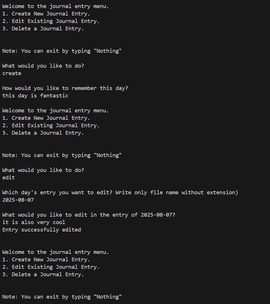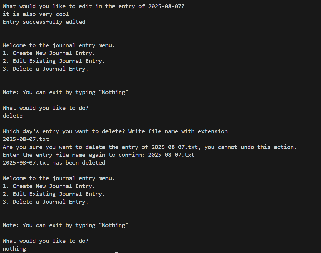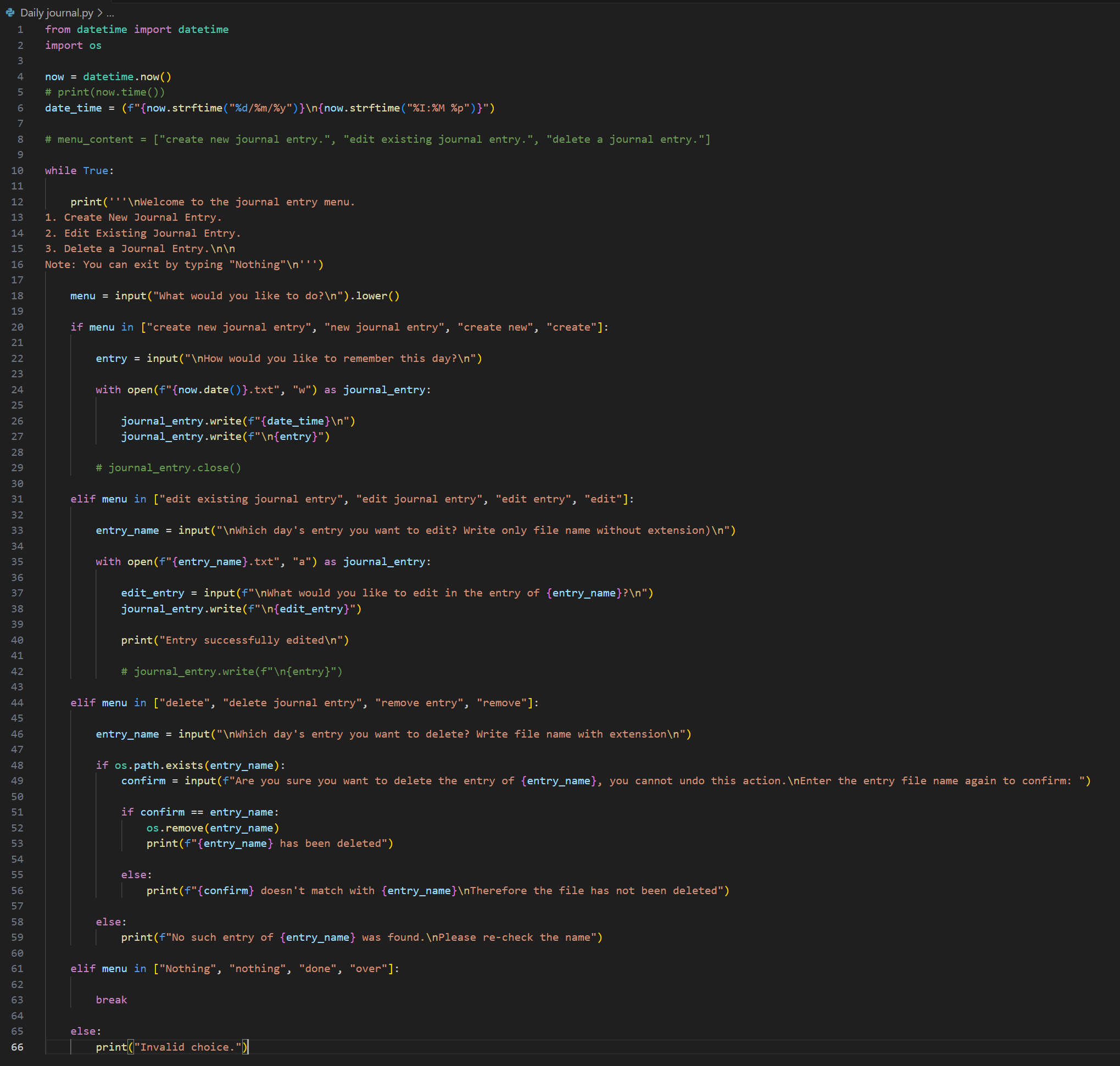 Day 11 of learning python as a beginner. Topic: creating journal entry program using file I/O. I got a little sidleline from my original plan of editing my to-do list program and created an entirely new program this time for writing a daily journal