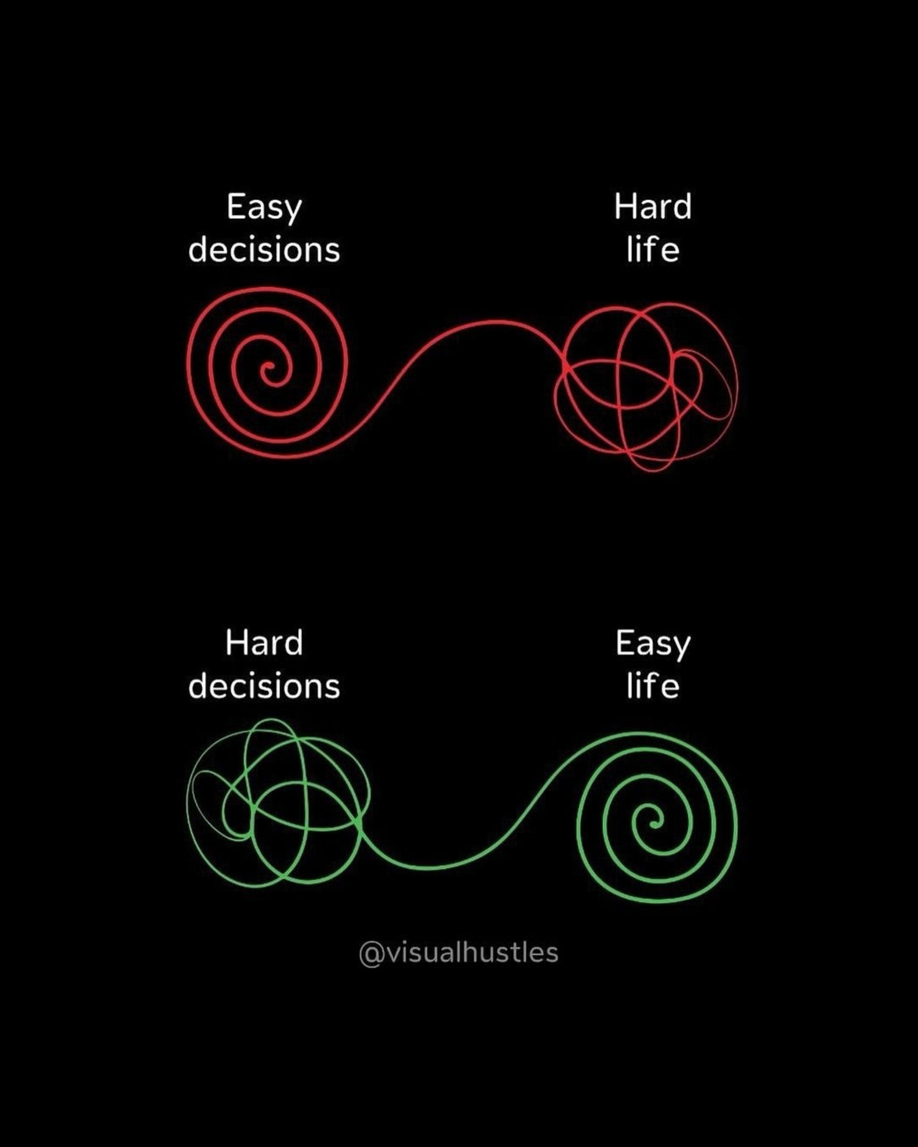 Choices shape lives. Easy decisions now = hard life later. Hard decisions now = easy life later. Discomfort is temporary. Growth is long-term. Choose wisely.