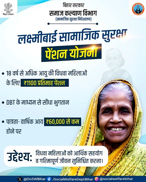 The Bihar Government has revised its Widow Pension Scheme – Laxmi Bai Samajik Suraksha Pension Yojana. Under this scheme, widowed women are now entitled to a ₹1,100/- monthly pension, directly transferred to their bank accounts. Eligibility: Widow,