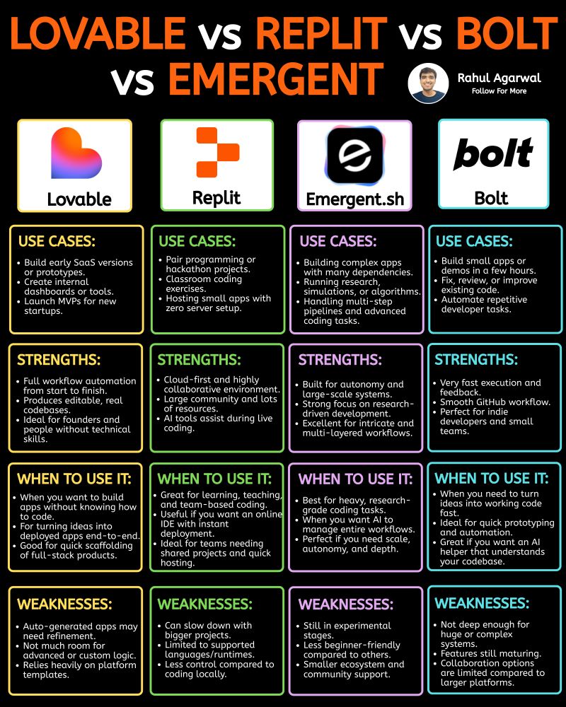 Lovable vs Replit vs Emergent vs Bolt. Iโve compared each platform in simple way below. 1. ๐๐ผ๐๐ฎ๐ฏ๐น๐ฒ This platform helps you ๐๐๐ฟ๐ป ๐ถ๐ฑ๐ฒ๐ฎ๐ ๐ถ๐ป๐๐ผ ๐๐ผ๐ฟ๐ธ๐ถ๐ป๐ด ๐ฎ๐ฝ๐ฝ๐, without needing advanced coding skills. โ Generate full apps en