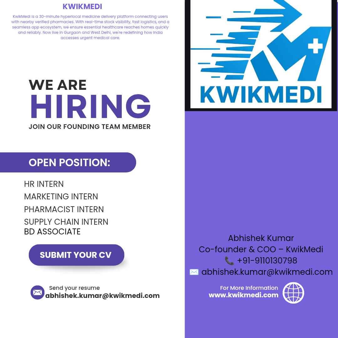 KwikMedi is hiring for multiple on-site roles in Gurgaon. Location: 7th Floor, Unit 708, ILD Trade Centre, Gurgaon Apply: abhishek.kumar@kwikmedi.com (mention role in subject) People in Delhi NCR can walk in directly for interviews BD Intern (UPTO 15K) (PHARMA BACKGROUND) HR Intern & Opration Intern (Upto 8k to 10k) Pharmacist intern (upto 8k to 10k) Degital Marketing Intern (upto 8k to 10k) Supply Chain intern (upto 8k to 10k) BD Associate (upto 35k) (PHARMA BACKGROUND)