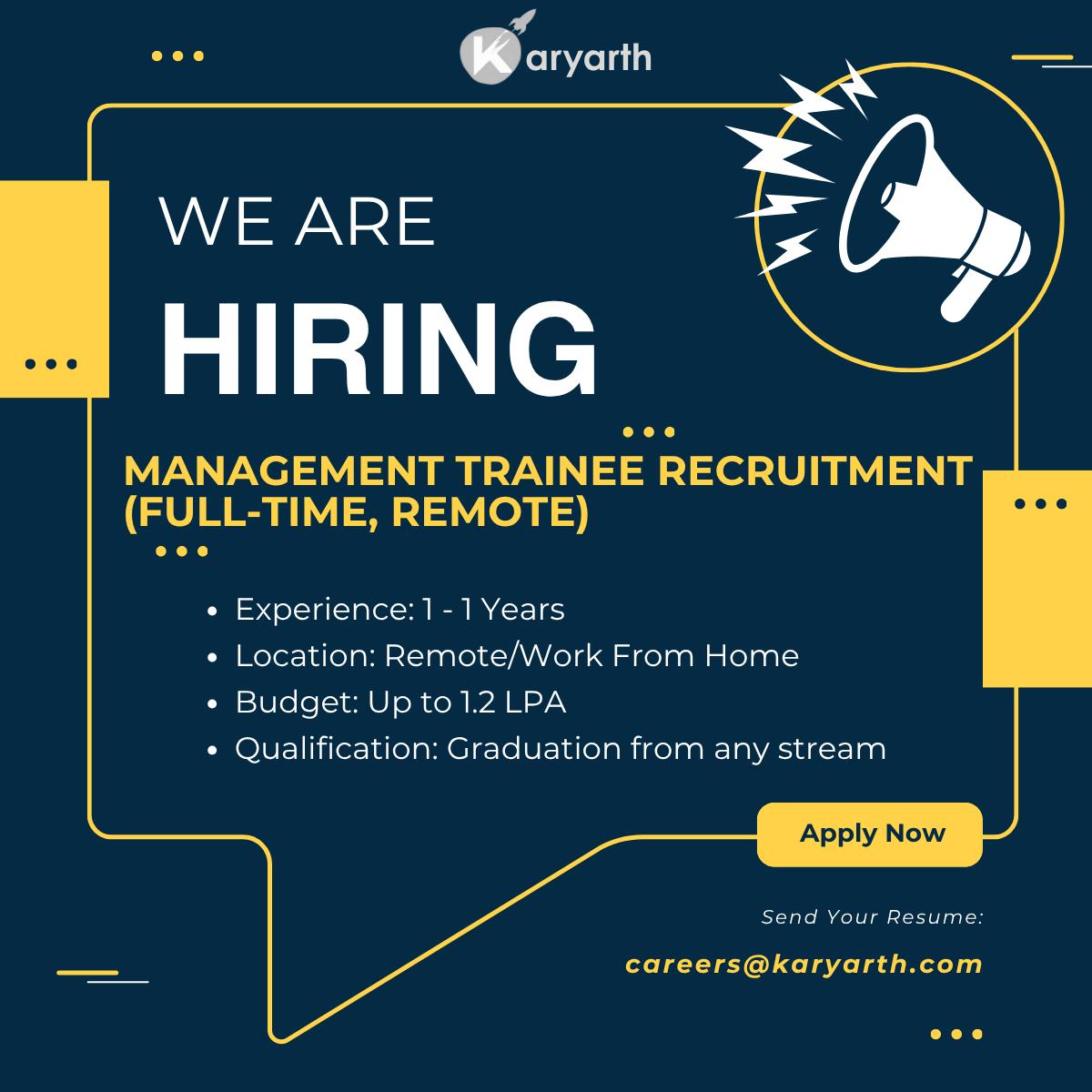 Want to launch your career in recruitment? This is your chance! Karyarth is hiring Management Trainees (Recruitment) for a full-time, 100% remote role. Youโll work on real mandates, connect with top talent, and learn how Indiaโs best startups hire.