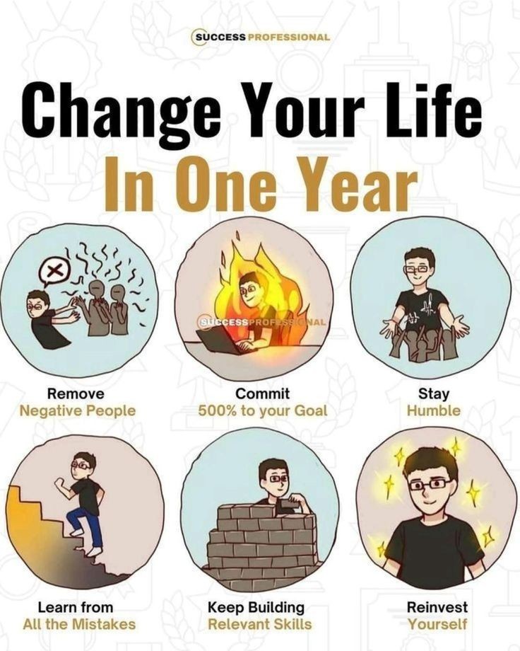 6 habbits change your life in one year 1. Remove Negative people 2.Commit your goal 500% 3. stay humble.... 4. Learn from all Mistakes 5. keep Building relevant skills 6. Reinvest Your self 7...