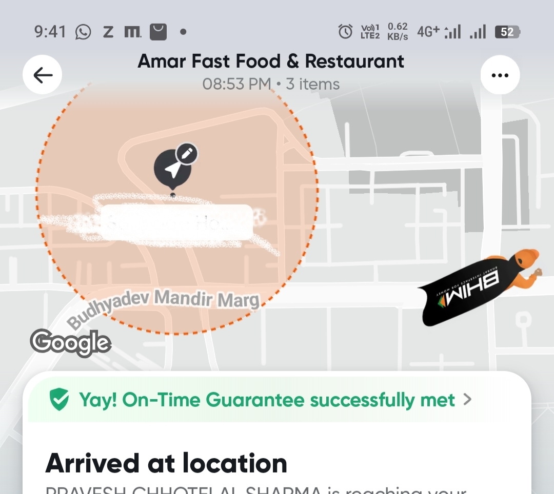 Clearly far away from delivery location even out of the proximity circle but Swiggy says On time guarantee successfully met🙂. If the delivery goes out of the circle it should reset again.