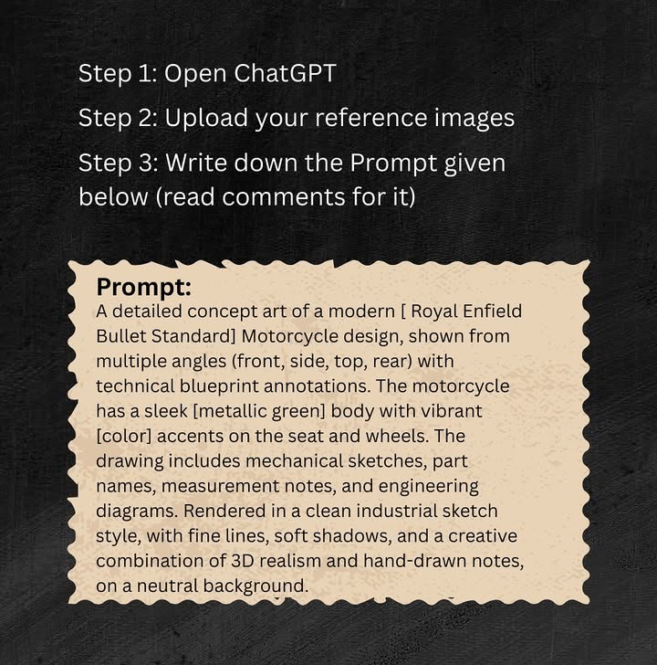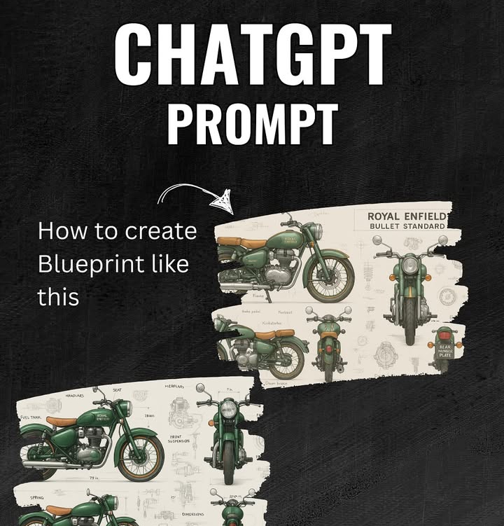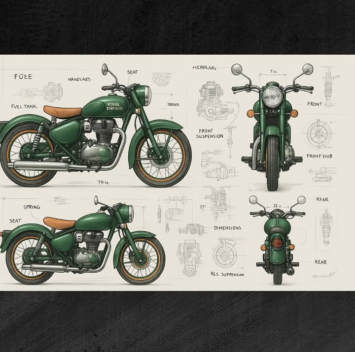 Create Blueprint With ChatGPT Prompt >> A detailed concept art of a modern [Royal Enfield Bullet Standard] Motorcycle design, shown from multiple angles (front, side, top, rear) with technical blueprint annotations. The motorcycle has a sleek [met