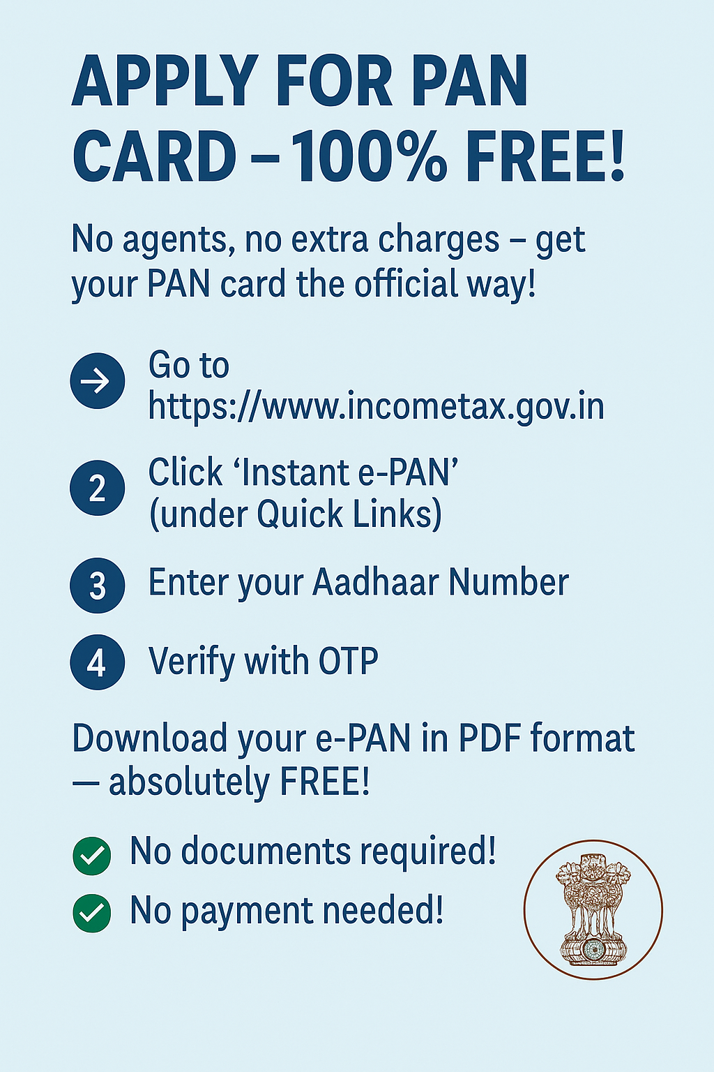 ๐ Apply for PAN Card โ 100% FREE! ๐ฎ๐ณ No agents, no extra charges โ get your PAN card the official way! ๐ฅ๏ธ Just follow these simple steps: 1๏ธโฃ Go to ๐ https://www.incometax.gov.in 2๏ธโฃ Click โInstant e-PANโ (under Quick Links) 3๏ธโฃ Enter your Aad