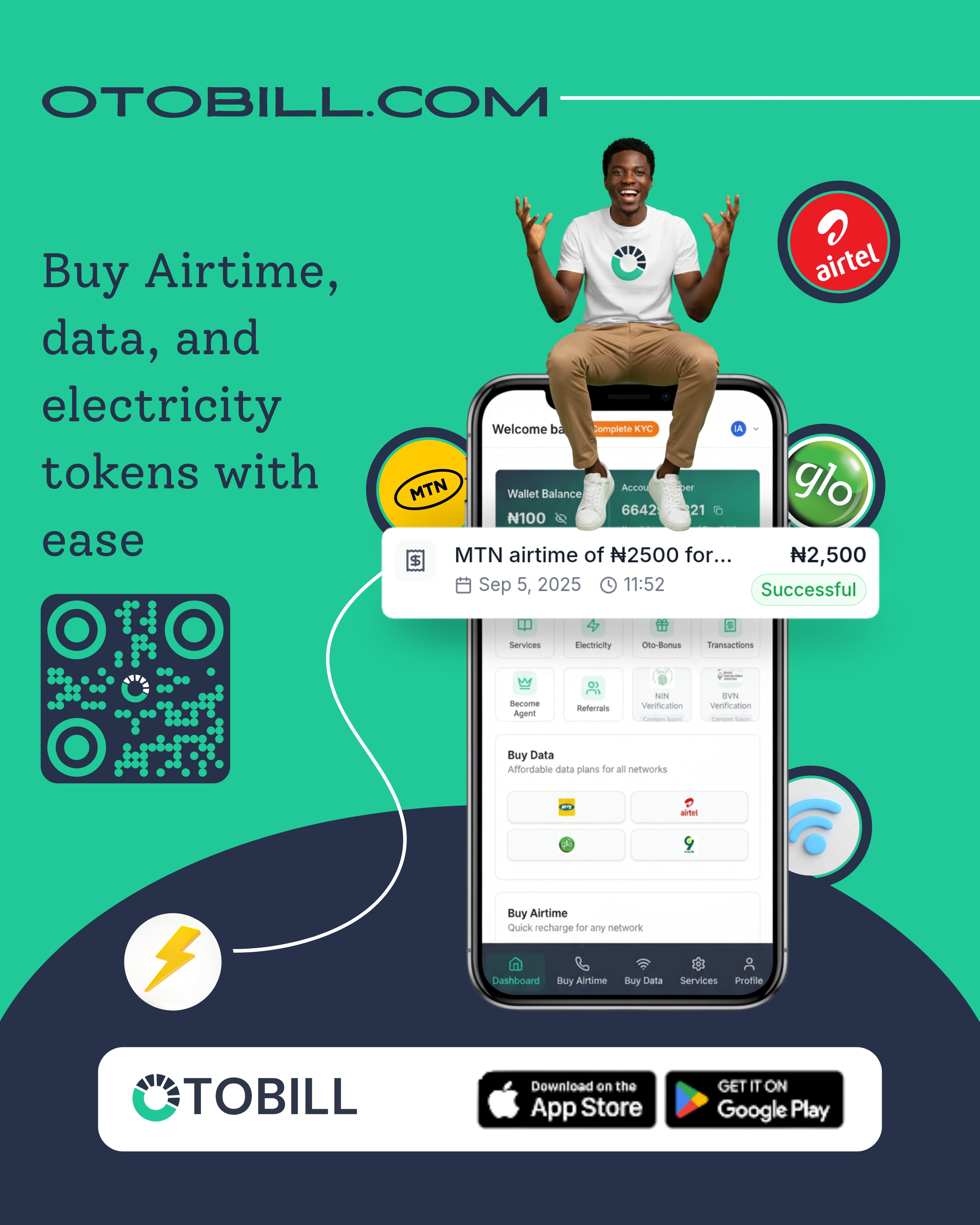 Top up your airtime, buy data bundles, and pay for electricity instantly with OtoBill. Secure, reliable, and affordable, designed to keep you connected anytime, anywhere. Get started today at otobill.com #OtoBill #BuyData #AirtimeTopUp #Electricity