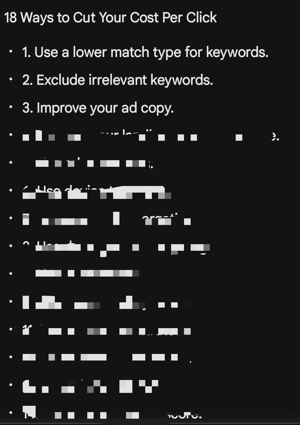 Find out 18 Creative Ways to cut your Cost per Clock. 1. Use a lower Match Type of Keyboards 2. Exclude irrelevant Keyword 3. Improve your ad copy leave your Name and email and I'll send you the details. Only the person who is in need will revive