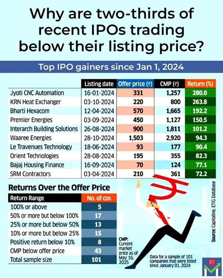 Around 101 mainboard companies that raised money through IPOs since 2024 , majority of them haven't been able to improve upon their listing gains.. As per ETG analysis, about 16% of the companies earned 50% or higher listing gains, while around 9%