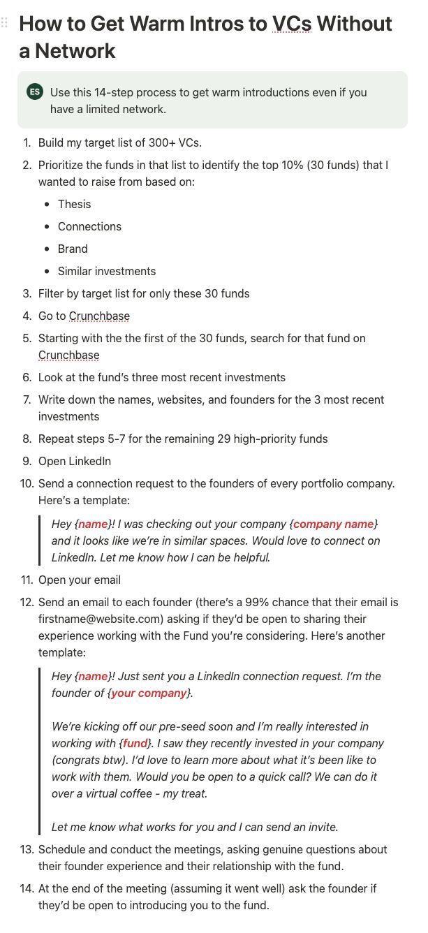 Tired of sending 200+ cold emails to VCs and hearing nothing back? You’re not alone. Most founders waste weeks doing this, getting zero replies. Here’s the truth: You don’t need “connections” to raise. You need a repeatable process that works. Toby Egbuna shared a brilliant way to engineer warm intros from scratch: 1️⃣ Start broad, then focus Build a list of 300+ VCs Narrow it down to your top 30 (look at thesis, brand, relevant deals, shared connections) 2️⃣ Do your homework Use Crunchbase to search each fund Write down the founders of their 3 latest portfolio companies 3️⃣ Reach out smartly Connect with these founders first No pitch. No ask. Just curiosity. Message template: "Hey [name], I’m the founder of [your company]. Saw [fund] invested in you. Would love to hear how it’s been working with them. Open to a quick 15-min chat?" 4️⃣ Have real conversations Ask thoughtful questions about their journey Learn how that fund actually supports founders 5️⃣ Ask for the intro If it goes well: "Would you be open to introducing me to the partner you worked with?" Why this wins: Higher success rate than cold outreach Real intel on funds before you pitch Relationships with fellow founders (who’ve been there) 💡 Great fundraisers don’t “spray and pray.” They build a system.